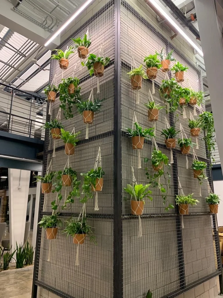 For this massive 80,000 square foot space, which was the former warehouse of the Austin Recycling Center and redesigned as an award-winning office space by IA Interior Architecture, the interior plant scape was designed to fill the voluminous open areas, add trailing greenery to the balconies and to complement the buildings industrial architectural elements. The design features more than 300 plants including a cactus garden and more than a dozen custom-fabricated planters for the second floor balcony. Central to the design and the building is a green wall of hanging macrame plantings suspended on a custom structure around an elevator.
